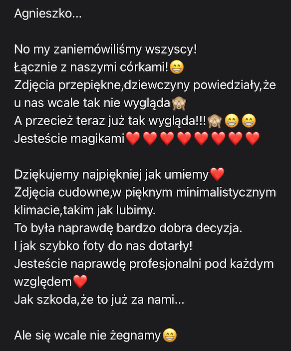 Jeśli czujesz, że to jest dokładnie to, czego chcesz – wspaniale, działajmy. Jeśli myślisz sobie, że fajnie, ale tak naprawdę potrzebujesz czegoś innego – bo chcesz mieć zdjęcia mega nastrojowe, romantyczne, przepuszczone przez złociste lub nostalgiczne filtry – to też świetnie. Super, że to wiesz! I poszukaj kogoś, kto robi dokładnie takie zdjęcia, o jakich marzysz.