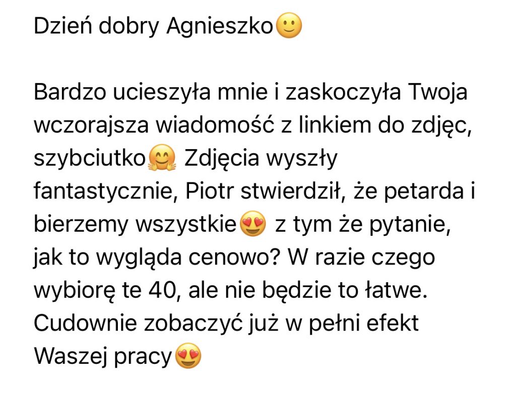 Zaliczka wynosi 2000 zł i nie podlega zwrotowi. Z tego względu, że jeszcze przed sesją przeznaczamy sporo czasu i energii na zbadanie twoich potrzeb oraz opracowanie koncepcji zdjęć.